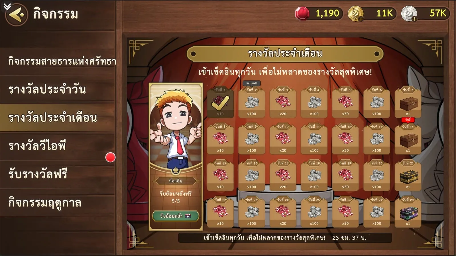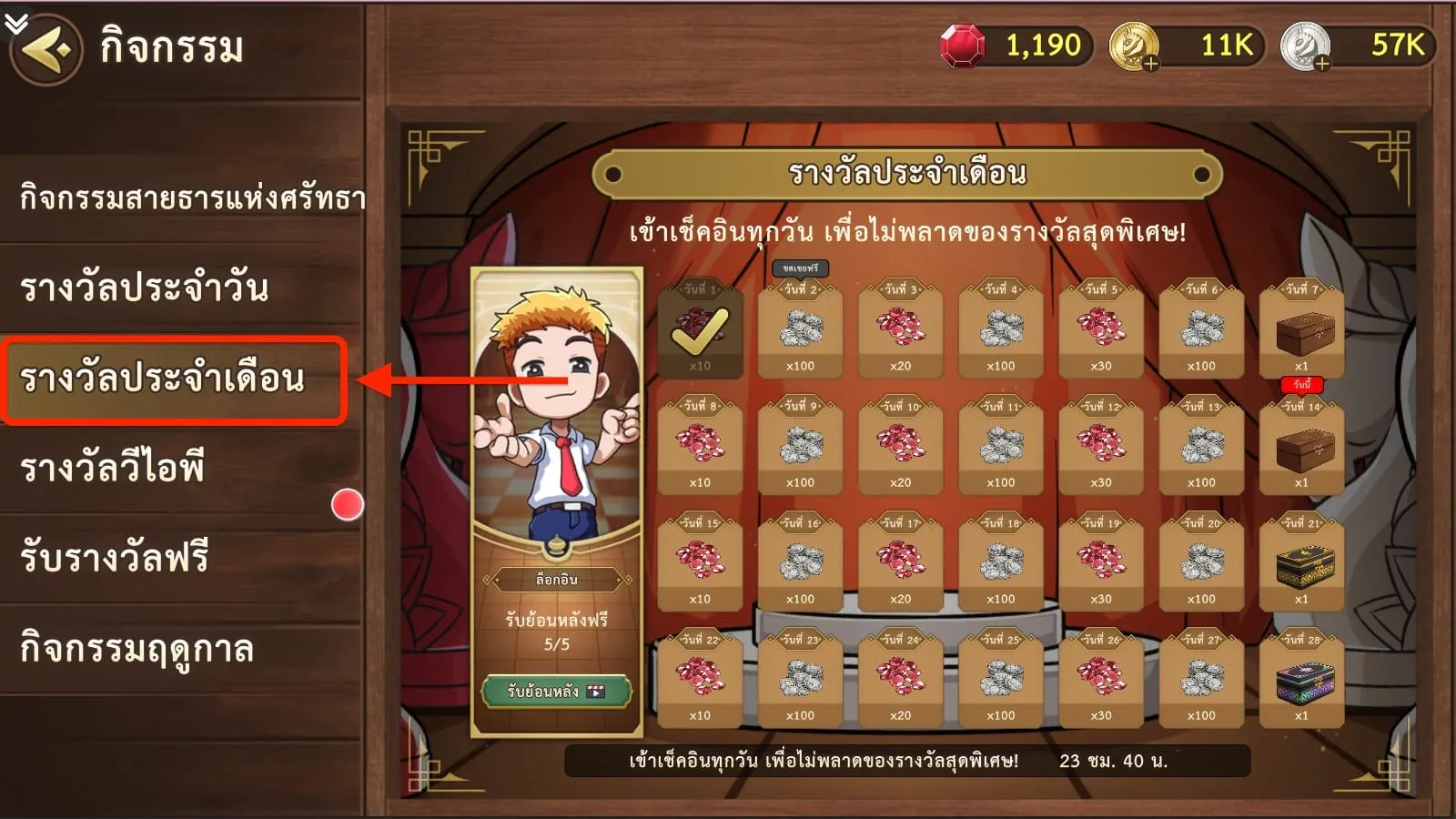 ขั้นตอนที่ 3 ผู้เล่นสามารถรับรางวัลตามวันที่ล็อคอินได้ โดย 1 วันสามารถรับได้เพียง 1 ครั้ง ยิ่งล็อคอินต่อเนื่อง จะทำให้ไม่ต้องเสียโควต้ารับย้อนหลัง โดยการรับย้อนหลัง จะสามารถรับได้สูงสุด 5 ครั้งต่อเดือน และต้องดูโฆษณาก่อนรับย้อนหลัง