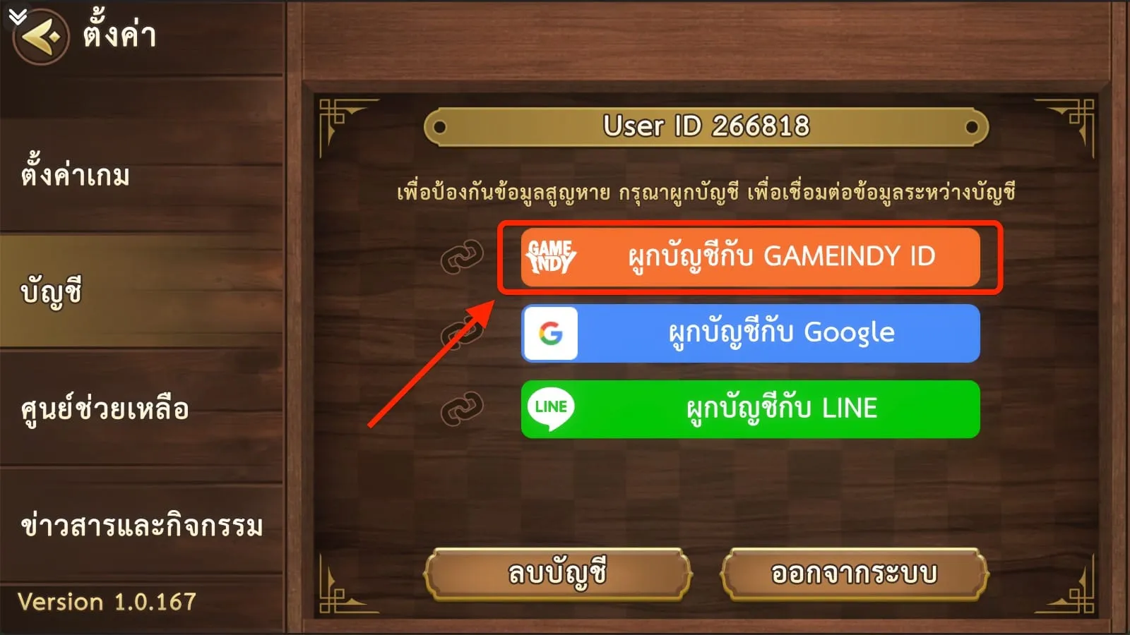 2.เลือกที่หัวข้อบัญชี จากนั้น เลือก ผูกบัญชีกับ GAMEINDY ID