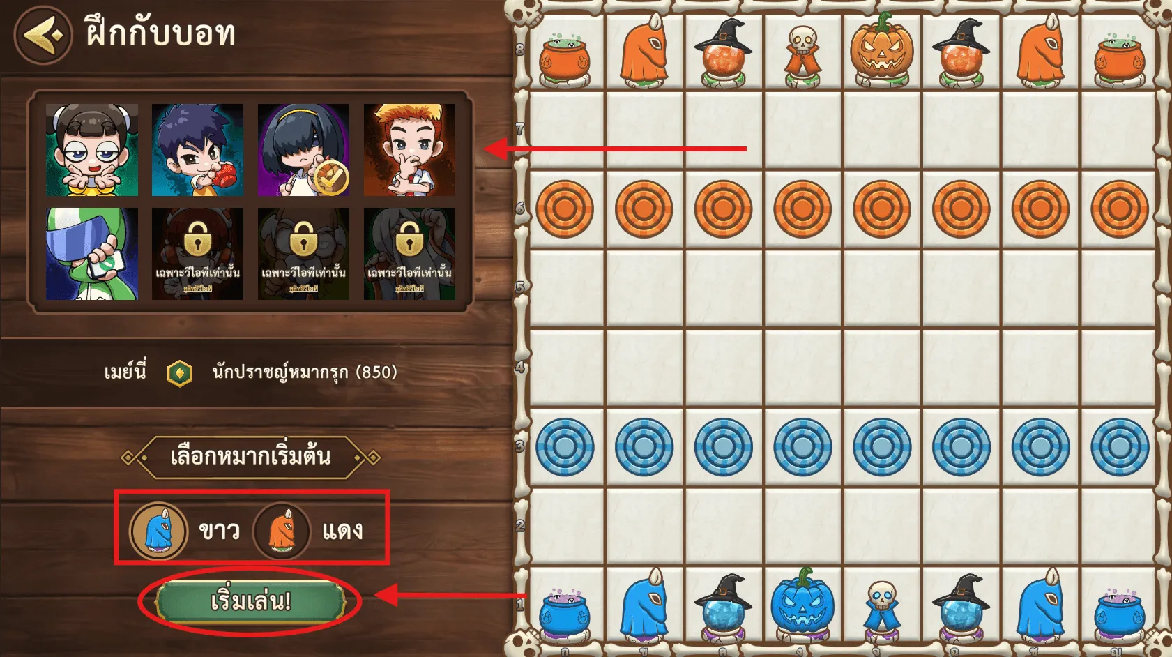 ขั้นตอนที่ 3 เลือกระดับความยากของ AI ตามต้องการ และเลือกหมากเริ่มต้นว่าอยากเริ่มจากฝั่งแดงหรือน้ำเงิน และกด "เริ่มเล่น" ได้เลยครับ (สามารถเลือกได้ 8 ระดับ) หากต้องการเลือก 3 ระดับสุดท้าย ต้องมีแพ็คเกจ VIP แพ็คใดก็ได้ จึงจะสามารถเลือกระดับที่สูงกว่าได้นั่นเองครับ
