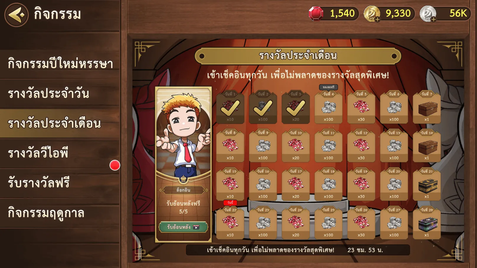 ตัวอย่าง กิจกรรมล็อคอินประจำเดือน โดยผู้เล่นสามารถรับรางวัลย้อนหลังได้สูงสุด 5 ครั้ง ผ่านการดูโฆษณา