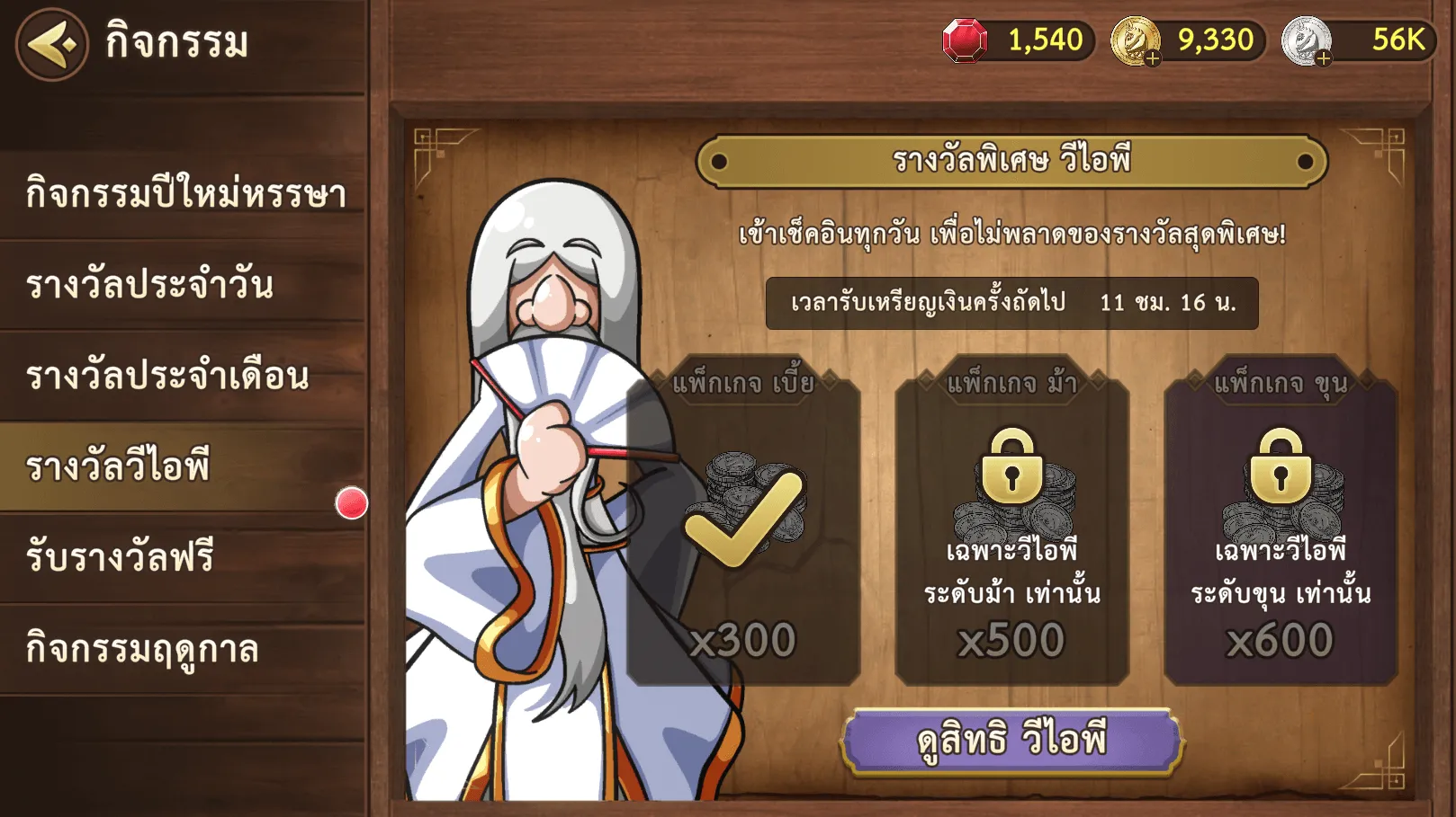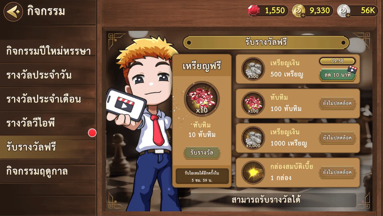 ตัวอย่าง หน้ารับรางวัลฟรี โดยผู้เล่นสามารถดูโฆษณาเพื่อลดระยะเวลารอของรางวัลต่างๆได้